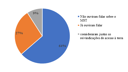 A terceira pergunta da pesquisa se referiu ao conhecimento e/ou informações referentes ao Movimento dos Trabalhadores Rurais Sem Terra (MST). Solicitou-se aos estudantes que informassem o que conheciam a respeito desse movimento social, suas reivindicações e como compreendem a frase “luta pela terra justa”. Conforme Gráfico 03, apurou-se que 27% dos estudantes alegaram já ter ouvido falar sobre o MST e 64% não, e apenas 9% dos estudantes disseram ser justas as reivindicações pela reforma agrária.