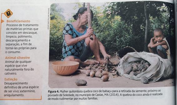 Mas o que o livro Expedição Geográfica tem a dizer sobre o assunto? Foi possível localizar que o referido material faz referência à questão de gênero no meio rural, por meio da representação do trabalho de uma mulher quilombola e quebradeira de coco (Figura 3). Entretanto, observa-se que o texto não menciona suas atividades econômicas, nem a sua importância como contribuição significativa na renda familiar, além de deixar oculta a importância de políticas públicas destinadas às mulheres que vivem no campo.