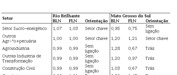 Com relação ao estado de Mato Grosso do Sul, apenas o setor “Outros agropecuária” se destaca como setor chave. É possível observar, ainda, a falta de ligação do setor Sucroenergético, fato que corrobora a importância deste setor para a economia do município de Rio Brilhante. Isto poderá ser ainda mais evidenciado por meio da análise dos multiplicadores de impacto setorial na tabela (4).