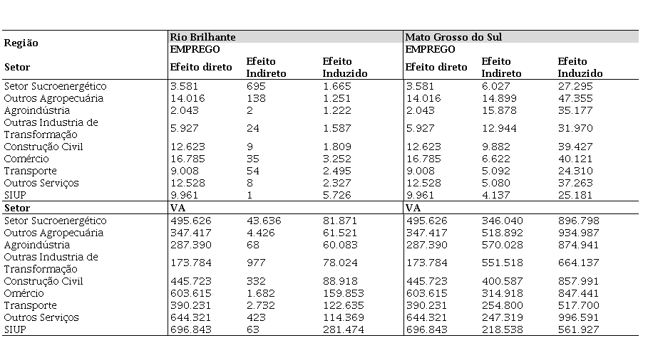 De forma geral, um multiplicador mede o impacto global de variações na demanda final do setor j sobre uma variável econômica de interesse, ou seja, mede o impacto de um aumento unitário na demanda final de um determinado setor sobre todos os setores que possuem algum grau de ligação com este (PORSSE, 2002; COSTA et al. 2005). Ao analisarmos o impacto do setor Sucroenergético no município de Rio Brilhante, no tocante a emprego, observamos que cada investimento de 1 milhão de unidades monetárias, gera 3.581 empregos diretos, 695 empregos indiretos e 1.665 empregos nos demais setores econômicos. Com relação ao Valor Adicionado (VA), o setor possui capacidade de gerar mais que R$ 495 mil de forma direta, ou seja, no mesmo setor, R$ 43 mil de forma indireta, nos setores que comercializam com o setor sucroenergético, e cerca de R$ 81 mil nos demais setores da economia.