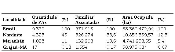 Os dados recentes do INCRA (2017) indicam que, na região Nordeste e no Maranhão, os projetos de assentamentos de famílias camponesas mantiveram-se em expansão nesta década. No município de Grajaú, objeto de análise neste trabalho, a criação dos assentamentos data desde 1987, com o Projeto de Assentamento (PA) Sítio do Meio. Posteriormente foram criados seis projetos de assentamentos de iniciativa estadual (PE), entre 1996 e 1997, e outros dez pelo INCRA, entre 2001 e 2008.