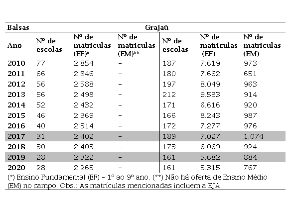 A tabela acima mostra apenas os números de escolas públicas de ensino fundamental situadas no espaço rural de Balsas. Nos dados do Censo Escolar/INEP há uma escola privada ou conveniada no campo de Balsas, todavia, não consta nenhum estudante matriculado no ensino fundamental ou médio. Já em Grajaú, os números das escolas públicas de ensino fundamental e médio do campo estão aglutinados.
