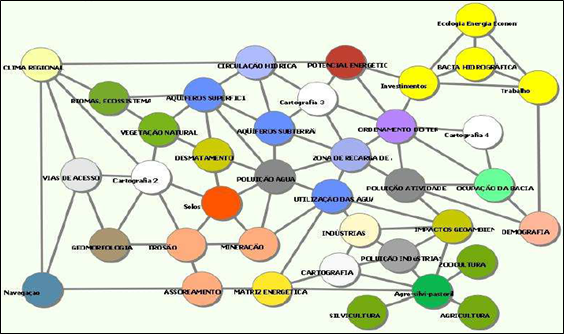 Desta forma, é possível concluir que para que as decisões a serem tomadas obtenham o mínimo possível de chance de erro, torna-se fundamental a construção de “uma arquitetura de conhecimentos complexa, que auxilie e permita construir modelos que apresentem soluções ótimas, por conseguinte a minimização de erros” (MARTINS Jr, 2014b, p. 88).Esta arquitetura de conhecimentos, pensada como um sistema de auxílio à decisão, por exemplo, de uma bacia hidrográfica em um município (Figura 2), será de grande utilidade para a execução de sua gestão ambiental. Os temas irredutíveis que possam estar dentro das rodas buscam atender às ideias de planejamento geoambiental e econômico da bacia em busca de seu próprio equilíbrio. Destaca-se que os temas presentes na imagem estão correlacionados e serão definidos a seguir.