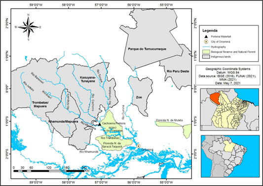 The Katxuyana people, speakers of the Katxuyana language, belonging to the Parukotoan group, a Guyanese branch of the Carib family of languages[2] (MEIRA, 2006), inhabit the region of the Trombetas River basin (Figure 1), on the banks of the Cachorro River and other subsidiary rivers in the municipality. from Oriximiná. This region is one of the most preserved areas in the Brazilian Amazon, largely covered by forests and with a low population density (0.4 inhab./km²), being inhabited by riverside communities, quilombola settlements – communities established by descendants of enslaved peoples – and indigenous peoples, who, in the course of the historical, social and cultural occupation process, were persecuted, having in the woods/forest their protection and refuge from the ills and human perversity produced by capitalism in this region.