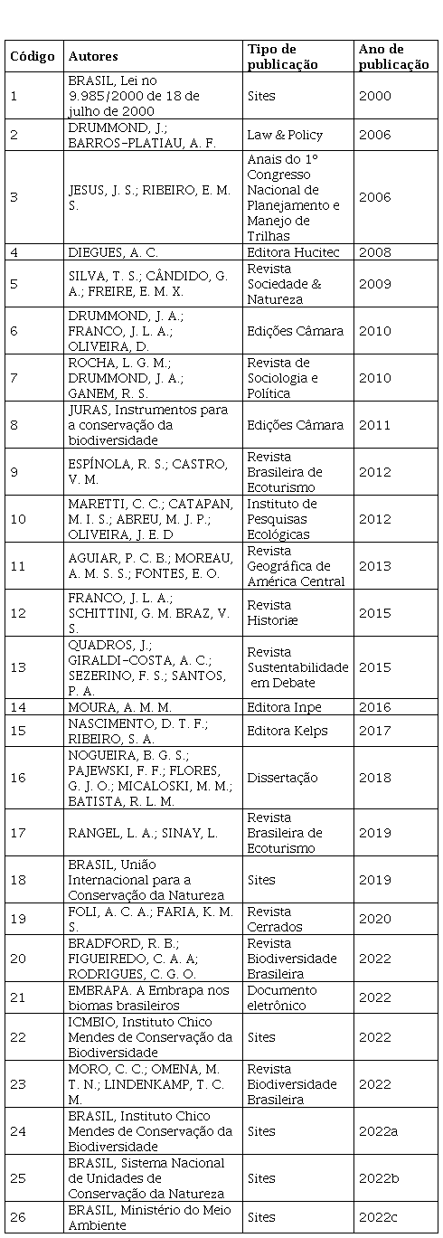 Dessa maneira, buscou-se a importância das áreas de conservação e a diferença entre elas. O site da SNUC – Sistema Nacional de Unidades de Conservação da Natureza e CNUC – Cadastro Nacional de Unidades de Conservação foram uma das fontes importantes para reconhecer as categorias de Áreas Protegidas e também foram importantes para o debate, além disso, outras publicações contribuíram para o enriquecimento do trabalho, como artigos, dissertações, anais de evento, livros, sites e capítulos de livro que relatassem o histórico de criação dos Parques Nacionais.