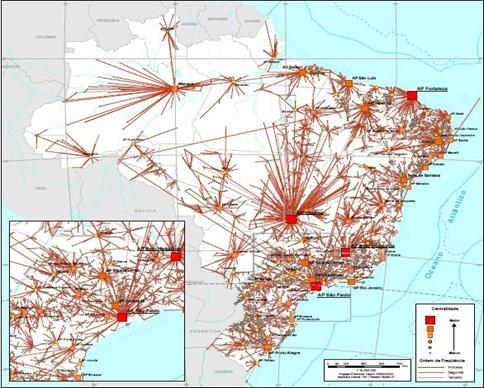 Arrais (2003), em seus estudos sobre rede urbana, categoriza Goiânia como uma Metrópole Regional, e que atualmente está entre as 15 maiores regiões de influência do país. Neste estudo, Arrais (2003) contempla os motivos da construção da “cidade-região”, destacando o potencial de consumo, a mobilidade entre núcleos e regiões do Brasil, a emergência de novos padrões de localização de atividade produtiva, o surgimento de novas espacialidades da economia brasileira. Além disso, a disposição geométrica que vai na direção dos principais eixos rodoviários é um fator relevante para a consolidação do Centro Goiano – em conjunto com Brasília (ARRAIS, 2003). A Figura 2 representa os fluxos nacionais de deslocamento para compra e vestuário e calçados, com destaque para a intensidade da rede do Arranjo Populacional de Goiânia.