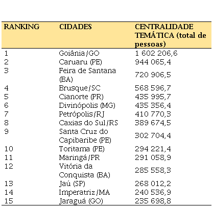 Como demonstramos, a centralidade é a característica fundamental para definição da regionalização e construção da “Região da 44”. Percebe-se, através de diversos artigos acadêmicos, notícias de jornais e documentos oficiais, a centralidade que a “Região da 44” exerce na atração de pessoas, mercadorias e serviços para Goiânia. Nesse sentido, e-se uma expansão do Centro Tradicional, chamada por Paula (2003) de Centro Novo ou Centro Expandido, áreas do espaço intraurbano que concentram equipamentos urbanos, promovendo a valorização da área e gerando uma centralidade polinucleada, que revelam a ação de dois agentes: o Estado e o mercado imobiliário. Por isso mesmo, a grande motivação para a proposta desta pesquisa sobre a “Região da 44” é perceber o fenômeno como uma centralidade no ramo têxtil nacional, conforme expresso na tabela 1.