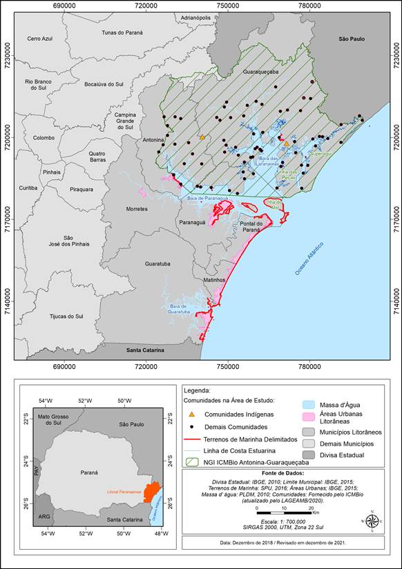 A área de estudo desta pesquisa corresponde ao NGI ICMBio Antonina-Guaraqueçaba, uma estrutura organizacional gerida pelo ICMBio, localizada na porção norte do litoral paranaense. O NGI abrange todo o município de Guaraqueçaba, parte dos municípios de Antonina e Paranaguá e uma pequena parte do município de Campina Grande do Sul (Figura 1).