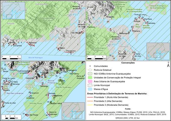 Além disso, observa-se que nestes locais onde quase não há mapeamento, existe um elevado número de comunidades, cerca de 90, algumas delas com presença de indivíduos tradicionais (pescadores artesanais, caiçaras e um território indígena delimitado – TI do Cerco Grande). Outro ponto levantado, é que, a ausência de delimitação dos terrenos de marinha nesta área, dificulta políticas voltadas à regularização fundiária, bem como a elaboração e implementação dos instrumentos de planejamento ambiental.