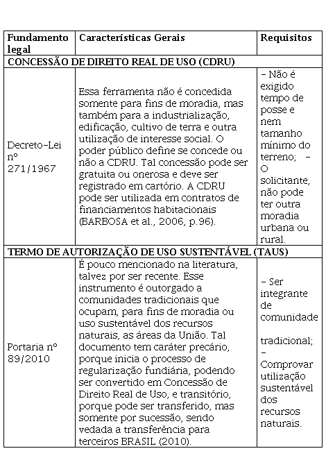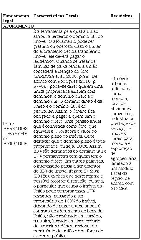 Conforme previsto no Art. 20 da Constituição Federal (BRASIL, 1988), a União é detentora de tipos diferentes de bens imóveis, que não serão citados um a um nesta pesquisa, dada a sua quantidade. Os terrenos de marinha representam apenas uma categoria de bens imóveis. O importante é saber que o uso dos imóveis da união, seja ele terreno de marinha ou outro tipo, está sujeito a instrumentos jurídicos que autorizam o seu uso. Deste modo, existem alguns instrumentos de outorga para o uso de imóveis da União, que serão apresentados no Quadro 1, 2 e 3.