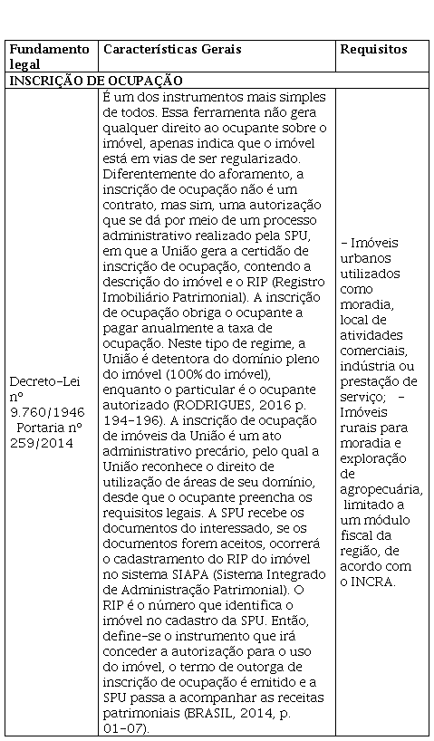 BRASIL. Secretaria de Patrimônio da União. Portaria nº 259, de 10 de outubro de 2014. Dispõe sobre a inscrição de ocupação em terrenos e imóveis da União, define procedimentos para a outorga, transferência e cancelamento e estabelece a definição do efetivo aproveitamento de que trata o art. 2, I, “b”, do Decreto n. 3.725, de 10 de janeiro de 2001. Portaria n. 259, de 10 de outubro de 2014. Secretaria do Patrimônio da União, 16, out. 2014. Disponível em: <https://www.gov.br/economia/pt-br/assuntos/patrimonio-da-uniao/arquivos-anteriores-privados/portarias-da-spu/arquivos/2016/portaria-259-2014-inscricao-de-ocupacao.pdf/view>. Acesso em: 26 mar 2018.