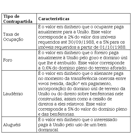 Cabe destacar que a utilização de algum bem da união por particulares, está sujeita a contrapartidas previstas na legislação (Art. 64 do Decreto-Lei 9.760/1946). Antes, porém, é importante ressaltar que a taxa de ocupação, o foro e o laudêmio, descritos a seguir, não são considerados taxas de natureza tributária, mas sim, constituem-se em receitas patrimoniais. Portanto, não estão sujeitos às disposições do código tributário nacional, mas sim, às disposições da legislação administrativa especial (RODRIGUES, 2016, p. 283).