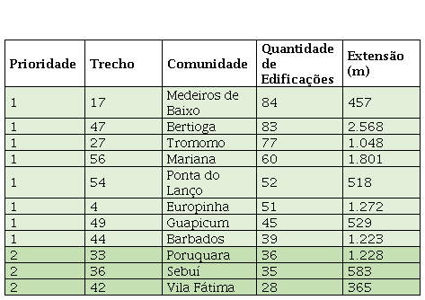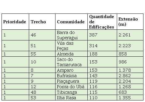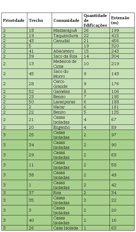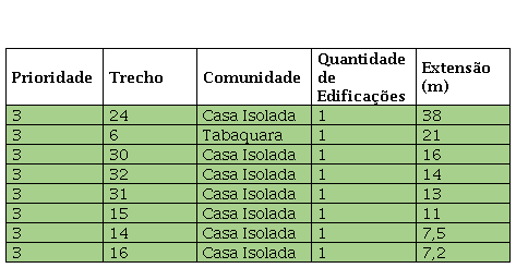 Já os trechos que foram classificados como prioridade 03, são as localidades de moderada demanda, pois caracterizam-se por serem pequenos aglomerados de casas, ou mesmo, construções isoladas (todas as edificações com distância acima de 300 metros umas das outras). Esse grupo se caracteriza pelas ocupações com até três edificações e extensão de 07 a 97 m. Juntos, esses trechos somaram 682 m, ocorrendo em 19 localidades (12 em Guaraqueçaba, 06 em Paranaguá e 01 em Antonina).