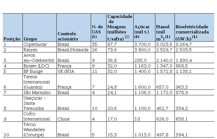 O aumento da produção e processamento da cana-de-açúcar vem contribuindo para o aumento da produção de açúcar e etanol no país, suprindo de certa forma o crescimento da demanda do mercado. Segundo estudos, a quantidade produzida de açúcar aumentou de 16,1 milhões para 29,6 milhões de toneladas entre as safras 2000/01 e 2019/20, enquanto a de etanol aumentou de 10,5 bilhões para 35,5 bilhões de litros. No entanto, esse crescimento tem sido acompanhado por um processo de oligopolização no mercado sucroenergético, onde um número cada vez menor de grupos econômicos altamente capitalizados e financeirizados estão se tornando dominantes. Grupos como Raízen, Biosev, São Martinho, Bunge, Tereos e CofcoAgri são exemplos de empresas que vêm ganhando espaço nesse setor (Tabela 1).