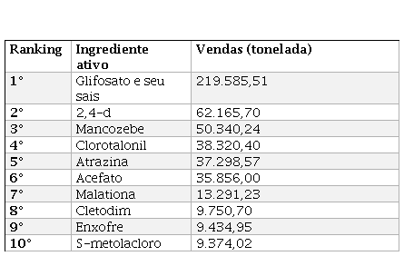 IBAMA. Consolidação de dados fornecidos pelas empresas registrantes de produtos técnicos, agrotóxicos e afins, conforme art. 41 do Decreto n° 4.074/2002. Brasília: Presidência da República, 2002.