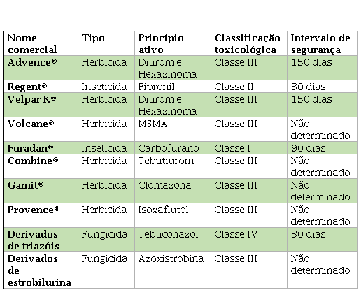No sítio da ANVISA, é possível obter informações atualizadas sobre os principais agrotóxicos empregados pelos produtores de cana-de-açúcar no Brasil. Ao analisar esses dados, é evidente que tanto os inseticidas quanto os herbicidas possuem um intervalo de segurança estabelecido, a fim de garantir a proteção dos trabalhadores rurais antes de retornarem às atividades no campo. Esses produtos agrotóxicos são autorizados de acordo com a legislação nacional vigente, conforme ilustrado na (Tabela 3) apresentada abaixo.