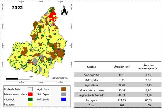 As atividades de uso da terra predominantes na BHRP são os cultivos agrícolas de lavouras irrigadas, como soja, milho e cana-de-açúcar, e pastagens plantadas para criação de gado leiteiro de corte (294,59 km²) (Figura 2). Essas atividades ocupavam, em 2022, cerca de 295 km² e são favorecidas pelas condições ambientais da região que apresenta relevos predominantemente planos a suave ondulado e solos profundos, como os Latossolos, que facilitam a mecanização.