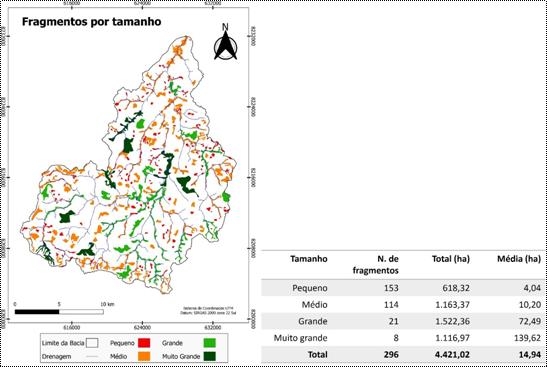 Foram mapeados 296 fragmentos de tamanhos variados que, juntos, somam 4.421,02 ha. Os fragmentos pequenos são predominantes, totalizando 153 manchas, variando de 0,44 ha a 9,92 ha, somando 618,32 ha. Os fragmentos classificados como médios totalizaram 114, com dimensões variando de 10,04 ha a 49,8 ha, somando 1.163,37 ha.