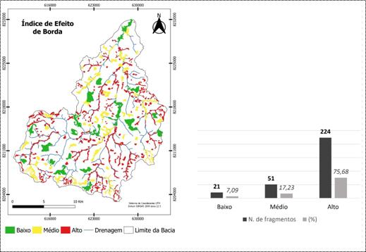 Na Figura 4, estão espacializados os fragmentos classificados de acordo com o IEB e apresentada a descrição quantitativa de cada classe. Pode-se observar que há o predomínio da classe alta de efeito de borda, com 224 fragmentos, que compreende 75,68% do total de 296 mapeados. Esses estão mais isolados, possuem formato mais circular ou feições lineares mais estreitas, acompanhando o leito dos rios. Os fragmentos com médio IEB, assim como os da classe alta, ocorrem principalmente nas margens dos cursos d’água, mostrando uma tendência de conservação das matas ciliares e/ou de galeria. Os fragmentos com IEB baixo apresentam maiores extensões, ocorrendo nos interflúvios em relevos mais planos.