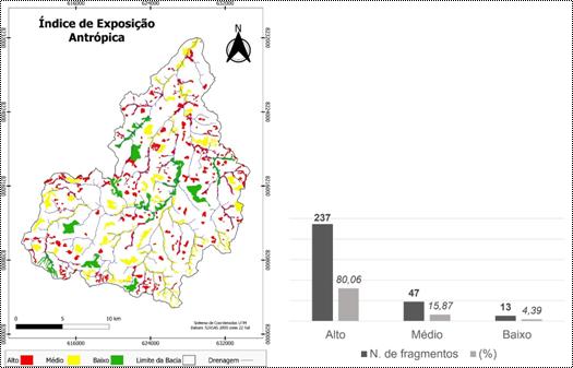 Na Figura 5, estão os resultados do mapeamento do IEA para a bacia, acompanhados dos dados quantitativos em relação a cada classe. Os resultados indicaram que 80,06% dos fragmentos da bacia – um total de 237 – apresentam IEA Alto, estando em condições críticas de possibilidade de extinção.