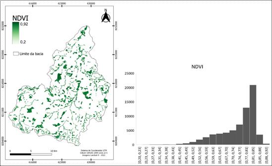 Na Figura 6, são apresentados a imagem do índice de NDVI dos fragmentos florestais da BHRP e o respectivo histograma. O índice variou de 0,2 a 0,92, com média de 0,75. Como se pode observar no histograma, o pico de frequência variou entre 0,81 e 0,85.