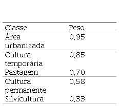 𝑈𝑖 = Peso atribuído ao tipo de cobertura e uso da terra do entorno em uma determinada faixa (Tabela 1);