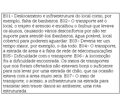 Esses apontamentos são corroborados pelas docentes ao serem questionadas sobre as dificuldades que constataram para a execução de uma aula de campo como essa.
