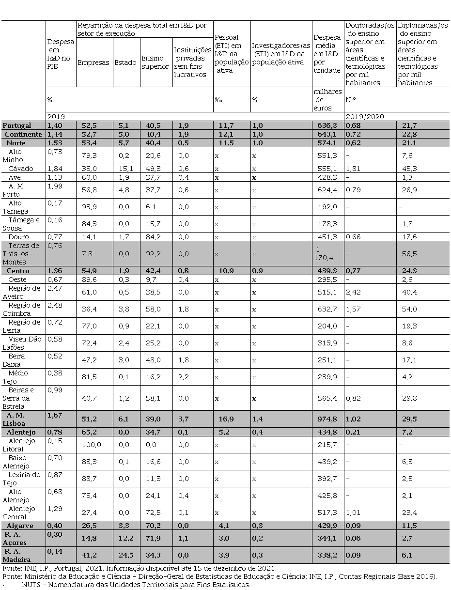 Referente aos indicadores de inovação, o município de Bragança não apresenta os melhores resultados quando comparado a outras regiões do país. Contudo, a criação do parque tecnológico proporcionou uma sinergia na sua capacidade inovativa. A participação de Portugal e suas regiões na despesa em Investigação e Desenvolvimento (I&D) no Produto Interno Bruto (PIB) é de 1,40%, conforme visualizado na Tabela 1. A área continental do país representa 1,44% (MEC/INE, 2022).