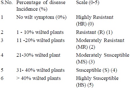 According to Hussain et al. (2005), bacterial wilt symptoms and total number of wilted plants per germplasm/variety were recorded on a 0-5 scale, with minor modifications. Based on the percentage of wilted plants, accessions were categorized as highly resistant to highly susceptible.