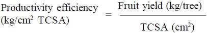 There were eight different Trunk Cross Sectional Area of tree (110.45, 118.23, 123.45, 131.67, 139.25, 146.82, 152.37 and 161.26 cm2) based on their trunk girth at 15 cm above the ground. The experiment was laid out in randomized block design with three replications and two trees per unit with almost uniform trunk cross-sectional area were kept for recording the observations. The trees were trained in Central Modified Leader system and pruning was done during dormant (December- January) depending upon the climatic condition. The trunk cross-sectional area of tree was calculated by using formula TCSA=Girth2/4 (Westwood et al., 1963). Observations on canopy volume, fruit number, size and yield were recorded during fruiting season. Fruits were harvested at maturity stage and yield per tree was calculated in kilogram. The productivity efficiency was calculated by formula: