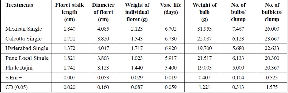 The present experiment was conducted at Floriculture Research Farm, Horticulture Science Section, ICAR- Central Coastal Agricultural Research Institute, Ela, Old Goa, Goa, India during 2014-2017. The state of Goa is located between 140 16" North latitude and 730 75" East longitude with the states of Maharashtra on the North and Karnataka on the East and South and Arabian Sea on the West. The five single type cultivars, viz., Mexican Single, Calcutta Single, Hyderabad Single, Pune Local Single and Phule Rajni,and six double type cultivars (Pearl Double, Arka Suvasini, Bidhan Rajani, Calcutta Double, Hyderabad double and Pune local double) were used for the present study. The uniform sized bulbs of size(2 cm diameter) were planted with the spacing of 45 x 30 cm in a plot size of 1.50 m x 1.0 m. Uniform cultural practices were adopted for all the cultivars. The experiment was laid out in randomized block design (RBD) with five replications. Ten plants from each plot were randomly selected for recording various observations. The observations were recorded for two consecutive years on vegetative growth, floral and bulb parameters. The observations, viz., plant height at shoot emergence (cm), number of leaves per plant, leaf length (cm), leaf width (cm), days to appearance of flower spike, number of florets per spike, length of spike (cm), diameter of spike (cm), fresh weight of the spike (g), stalk length of the floret (cm), diameter of the floret (cm), fresh weight of the individual floret (g), vase life of the spikes (days), weight of the bulbs, average number of bulbs per clump and bulblets per clump were recorded. The data recorded on various parameters were compiled and analysed statistically as per the methods described by Panse and Sukhatme (1985).