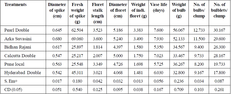 The maximum bulb weight per plant were recorded in cultivar Pearl Double (56.06 g), whereas, minimum (32.80 g) in Hyderabad Double in double flower type of tuberoses evaluated under the present study (Table 4).The cultivars with more number of leaves have higher photosynthetic activity, source sink relationship, thereby accumulating more amount of carbohydrates and improved bulb weight per plant under prevailing environmental conditions. The significant variation in bulb weight of different tuberose cultivars were also recorded earlier by Mahawer et al. 2008.