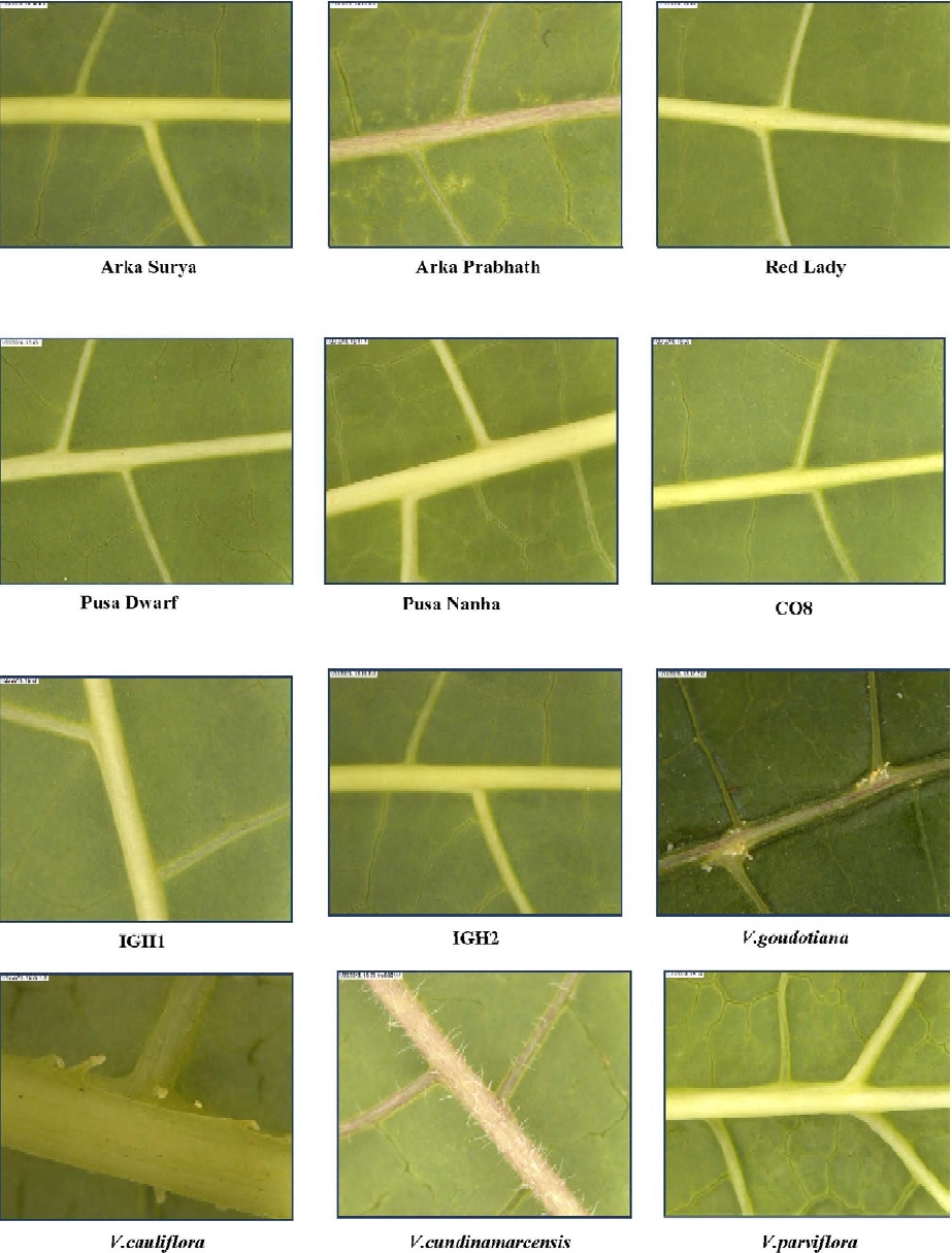The accessions such as Arka Surya, Arka Prabhath, Red Lady, Pusa Dwarf, Pusa Nanha, TNAU Papaya CO8, IGH1, IGH2 and V. goudotiana lack leaf pubescence on both dorsal and ventral surfaces (Fig.1). However, the wild species viz., V. cauliflora, V. cundinamarcensis and V. goudotiana had leaf pubescence with higher trichome density on ventral surface than dorsal surface. Trichome density was highest in V. cundinamarcensis (192.75/cm2 ) followed by V. cauliflora (25.25/cm2) and V. goudotiana (14.88/cm2).