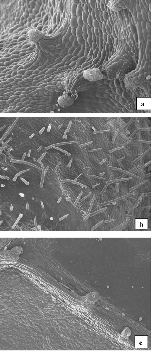 The type of trichome on the leaves were also observed under scanning electron microscope. V. cundinamarcensis consisted of single celled non- glandular trichomes, whereas V. cauliflora and V. goudotiana comprised of multicellular glandular trichomes (Fig.2). Trichomes were present as extension of veins in V. cauliflora and V. goudotiana, while these were distributed throughout the leaf surface in V. cundinamarcensis.