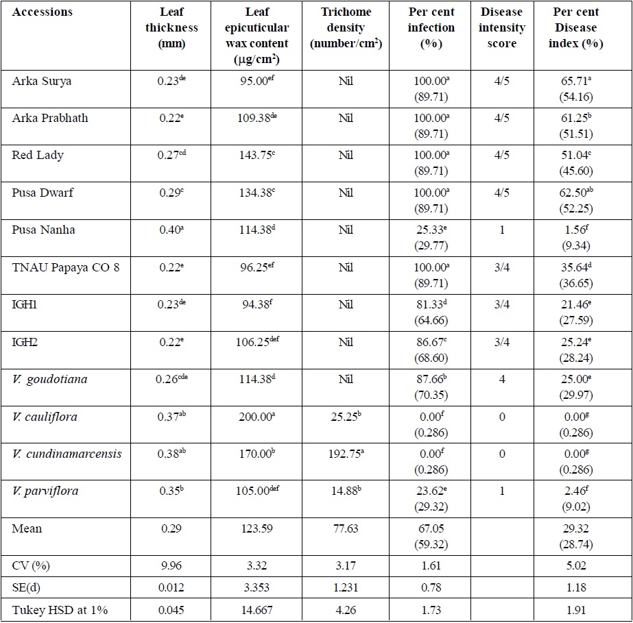 * <0.05 p value shows significant correlationHigher field tolerance to PRSV was observed in ‘Pusa Nanha’, which had thicker leaves. The PRSV incidence was significantly low in both V. cauliflora and V. cundinamarcensis, which registered thicker leaves, higher epicuticular wax content and denser trichomes. The preliminary study broadly indicates that leaf thickness, presence of trichomes in higher density and epicuticular wax content in papaya is likely to play a definitive role towards reduction in PRSV incidence probably by restricting the aphid vector incidence.