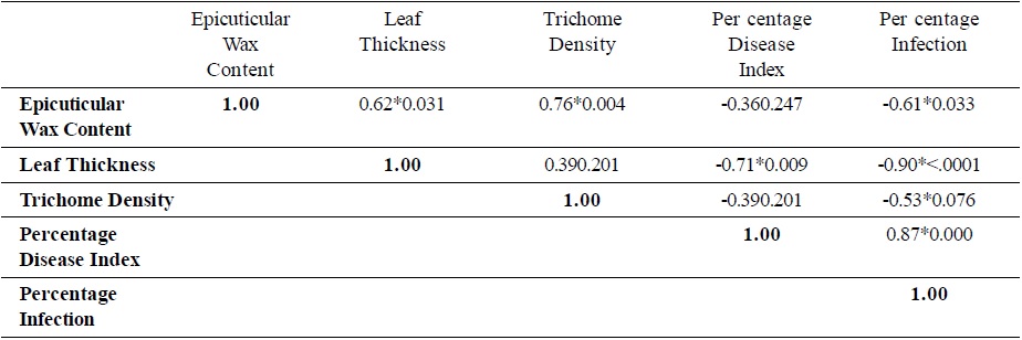 Leaf thickness was negatively correlated with PDI and infection percentage. Leaf thickness was positively contributed by the epicuticular wax content, which indirectly influences the disease tolerance or resistance. Thick cell wall has been attributed to resist the feeding activity of aphids (Guerrieri and Digilo, 2008).