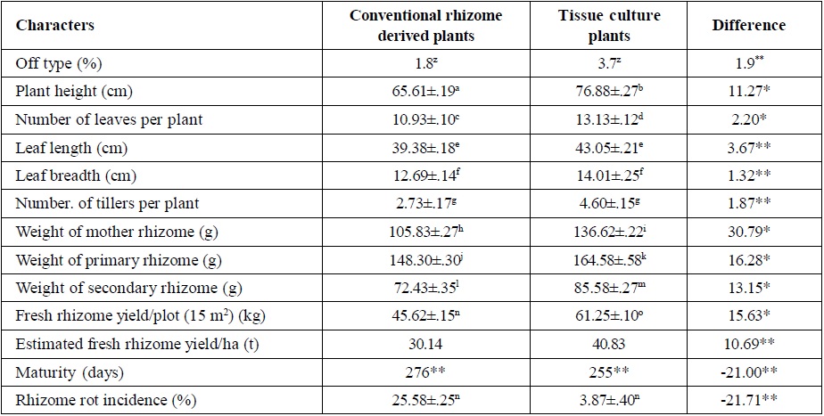 * Significant at p d” 0.05** non-significant*** maturity date, when 95% of leaves become yellowish. Means followed by same letters are not significantly different at p = 0.05.True-to-type plants were included in the analysis of variance of the horticultural performance of conventional propagated vs. micropropagated plants of turmeric var. CO 2.Growth and yield parameters were recorded on tissue culture and rhizome derived plants, which showed significant differences in all charactersexcept number of tillers, leaf length and breadth (Table 1). In vitro turmeric was significantly taller than the conventional type, throughout the vegetative growth cycle. Plant height is a measure of plant vigour, indicating that in vitro plants established more quickly and grows vigorously than conventional plants (Dirk et al., 1996; Sheela et al., 2001). The tissue culture plants showed vigorous and fast increase in the length of shoots as well as new shoot emerged out from the base after one week. Development was more advanced (76.88±.27 cm) than that reached by conventional plant (65.61±.19 cm) of the same age after 6 months. Similar result was documented by Beruto et al. (1996) in Ranunculus asiaticus and Singh et al. (2013) in turmeric.