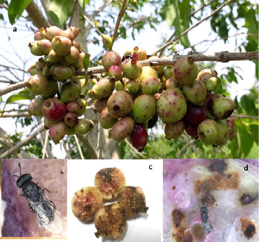 Fruits of Jamun, Syzium cumini L. (Family Myrtaceae; commonly known as jambul, black plum, Indian blackberry, jambulan, java plum etc.) are known for their economic importance with several medicinal properties (Warrier et al., 1996). Jamun is attacked by number of insect pests and recently a eulophid seed borer, Anselmella kerrichi (Narayanan et al.,) (Hymenoptera: Chalcidoidea: Eulophidae) causing huge economic losses in jamun cultivation have been reported (Kamala Jayanthi et al., 2019; Anjana et al., 2019). The adult female wasp lays eggs inside the tender fruits. After completing the life cycle inside the Jamun seeds, fully-grown adults emerge out making a circular hole, in turn causing both quantitative and qualitative losses. The infested fruits bore black, pinprick size oviposition punctures along with circular exit holes on the rind. Heavy infestation of jamun fruits by A. kerrichi rendering the fruits unmarketable was observed (Fig.1).