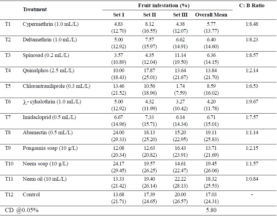 A total of 1200 fruits were harvested for each treatment. Each set containing 1200 fruits per treatment in which randomly 400 fruits per replication were observed. Keeping the fact in view that jamun fruits are consumed fresh for its high medicinal value, all the experimental sprays were restricted to early stages of fruiting (during G3 to G4 stages; Kamala Jayanthi et al., 2019) to avoid pesticide residue issues. The observations were recorded on total number of fruits and number of fruits infested with jamun seed borer. Data were subjected to ANOVA (using F test as criteria at P=0.05 level). Net benefit per acre for each treatment was derived by subtracting the total cost of plant protection from total income. Cost: Benefit ratio of each treatment was derived by subtracting the income of the control treatment from the net income of each sprayed treatment and the products were divided by total cost of plant protection for each treatment (Shabozoi et al., 2011).