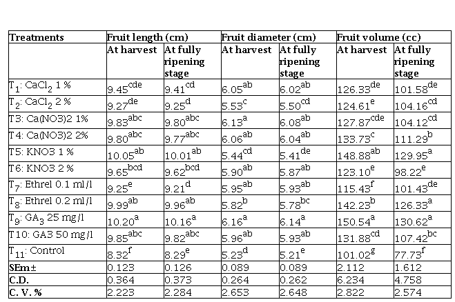 Potassium plays an important role in photosynthesis, synthesis of carbohydrates, oils, fats and proteins. It is also involved in the transportation of photosynthates towards the sink and enhances the production of protein (Lu et al., 2016). Potassium is an important nutrient for fruit weight and quality. Potassium is required for the production and transport of plant sugars that increase the weight of fruit (Jaiswal et al. 2021). Ethrel releases ethylene gas, influences the growth and development of fruits. Ethrel is responsible for early development of many fruits characterized by a high rate of ethylene evolution and hastens the ripening process with uniform colour development (Dhillon, 2013). Calcium is known to be essential plant nutrient involved in a number of physiological processes concerning membrane structure, function and enzyme activity (Jones and Lunt, 1967). It has received considerable attention in recent years due to its desirable effects in delaying ripening and senescence, increasing firmness, reduce respiration, extending storage life and reducing the incidence of physiological disorders and storage rots. Preharvest application of these compounds hinders the fruit ripening without affecting the edible quality. Preharvest application of CaCl. extends the shelf life and restrict the microbial infection without any detrimental effect and protects against post-harvest deterioration and extend shelf life (Saure, 2005). Gibberellic acid has been found to enhance the fruit size, increase the yield, and improve the physico- chemical characteristics of fruits through modification of various physiological and bio- chemical processes (Pandey and Sinha, 2013). Gibberellic acid in proper concentration and at appropriate time have been found to better results in fruits quality, yield, size, decrease fruit drop, increasing sugar content, improve the physico- chemical characteristics and extend the post-harvest life of fruits through modification of various physiological and bio-chemical processes of plant (Pandey and Sinha, 2013). Gibberellins have been useful in enhancing fruit retention and improving the size and quality of fruits. Further, gibberellic acid has anti-senescent property and help in maintaining cell wall integration and prevents growth of pathogen in the fruits and extend shelf life (Prasad, 2006).