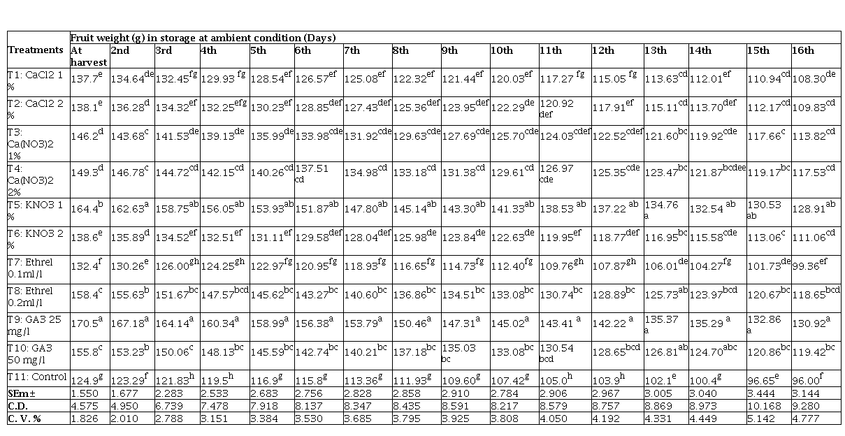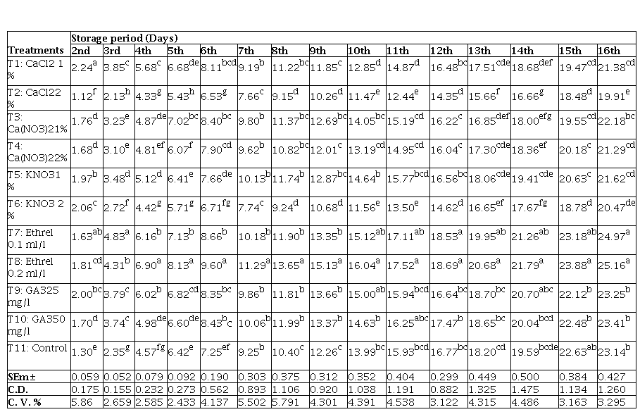 The fruit size is an important consideration for consumer preference. The effect of treatments on fruit size viz. length and diameter were found to be significant at harvest as well as at fully ripe stage (Table 1). The fruit length (10.20 cm) at harvest stage was found significantly maximum with GA. 25 mg/l treatment followed by the treatments of KNO.1 %, GA3 25 mg/l followed by Ca(NO3)2 1% and 2%, GA3 50 mg/l, Ethrel 0.1 ml/l and KNO. 2%. The significant effect of treatments was found on fruit volume at harvest as well as at fully ripe stage. Preharvest sprayed with GA. 25 mg/l reported significantly highest fruit volume (150.54 cc) at harvest followed by KNO. 1% and at fully ripe stage (fruit volume - 130.62 cc) also found maximum in treatments of GA. 25 mg/l followed by KNO. 1% and Ethrel 0.2 ml/l under ambient storage condition (Table 1). The fruit weight was significantly influenced by various chemicals and plant growth regulators at everyday up to last ripening stage. Application of GA. 25 mg/l Ethrel 0.2 ml/l, GA3 50 mg/l, Ca(NO3)2 1% and 2% while at fully ripe stage significantly maximum fruit length l (10.16 cm) was recorded with GA. 25 mg/ followed by treatments of Ethrel 0.2 ml/l, GA. 50 mg/ l, Ca(NO.). 1% and 2%. The maximum fruit diameter (6.16 cm) at harvest stage was found significant in treatment of GA3 25 mg/l and Ca(NO3)2 1% followed by Ca(NO3)2 2%, CaCl2 1%, GA3 50 mg/l, Ethrel 0.1 ml/l, KNO. 2% while, at fully ripe stage after storage under ambient condition the diameter of fruits (6.14 cm) was found significantly maximum in treatment of depicted significantly maximum fruit weight (170.50 g) at harvest and consistently up to 16th day of storage period under ambient condition as compared to rest of the treatments (Table 2). The lowest fruit weight, length, diameter and volume were recorded in the control at both the stages i.e.at harvest and fully ripe stage.