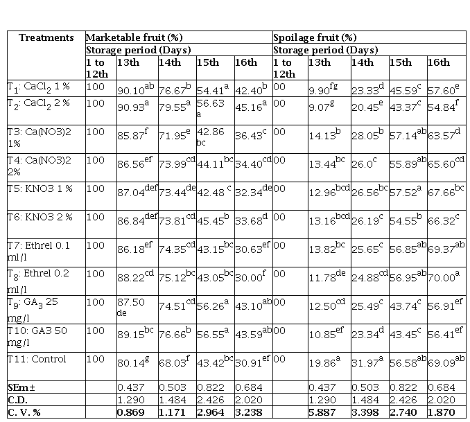 Moisture content of the fruits is an important consideration for its freshness and stability to the storage for a longer duration. The physiological loss in weight in mango fruits was tended to increase during the storage irrespective of the treatments. This could be due to increased moisture loss and enhanced shriveling (Lata et al. 2017). Fruits sprayed with CaCl. 2 % retained the minimum physiological loss in weight and spoilage per cent and maximum shelf life & marketable fruit per cent as compared to rest of the treatments.
