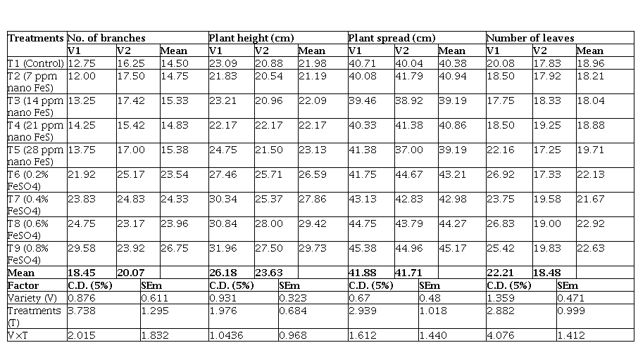Irrespective of the varieties, spray of FeSO4 recorded significantly more number of branches (26.75) in T9 than rest of the treatments, however, it was recorded minimum (14.50) in control (T1). The variety Fiesta Yellow had maximum number of branches (20.07) over variety Fiesta Gitana Mix (18.45). Among the interaction, a greater number of branches (29.58) were recorded in V1T9 followed by V2T6 (25.17) which were statistically at par with other treatments. However, number of branches was recorded minimum (12.00) in variety Fiesta Gitana Mix sprayed with 21 ppm nano FeS (V1T2). Torabian et al. (2018) reported that increased growth in sunflower grown under saline condition by application of FeSO4 both in normal and nano form which is due to increased leaf area, net CO2 assimilation, sub-stomatal CO2 concentration, chlorophyll content, etc. Likewise, Yuan et al. (2018) also reported that iron NPs promoted plant growth of Capsicum annum by increasing chloroplast numbers and grana stacking. In the present investigation, the lesser number of branches in nanoparticle treated plants against macro iron treatment might be due to their insufficient quantity as compared to macro forms. However, number of branches was recorded minimum (12.00) in variety Fiesta Gitana Mix sprayed with 21 ppm nano FeS (V1T2). Torabian et al. (2018) reported that increased growth in sunflower grown under saline condition by application of FeSO4 both in normal and nano form which is due to increased leaf area, net CO2 assimilation, sub-stomatal CO2 concentration, chlorophyll content, etc. Likewise, Yuan et al. (2018) also reported that iron NPs promoted plant growth of Capsicum annum by increasing chloroplast numbers and grana stacking. In the present investigation, the lesser number of branches in nanoparticle treated lants against macro iron treatment might be due to their insufficient quantity as compared to macro forms.