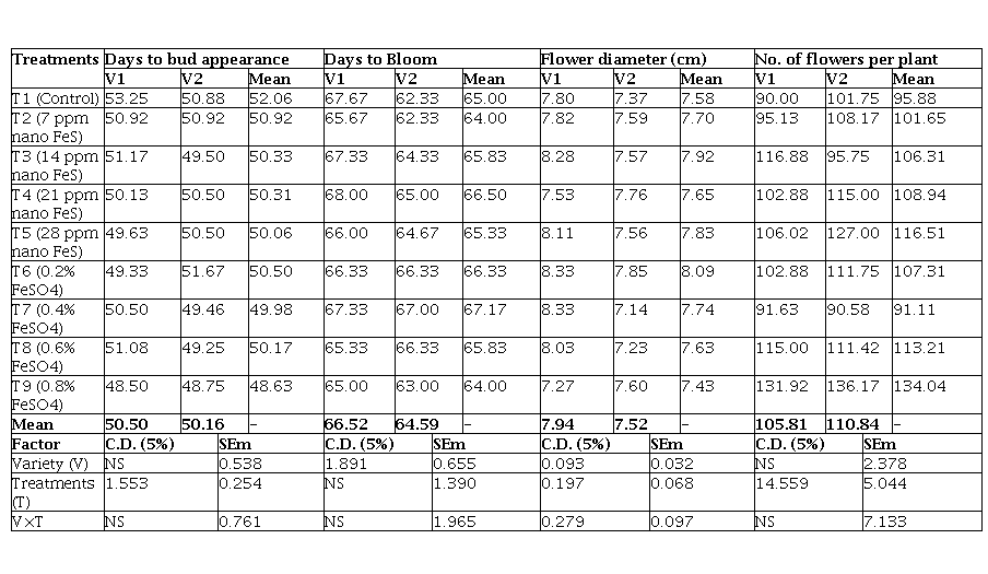 The days to bloom was significantly influenced by varieties, however, treatment and variety-treatment interaction was non-significant. Significantly more days to bloom (65.00 days) was recorded in variety Fiesta Gitana Mix than variety Fiesta Yellow (64.59 days). Tayade et al. (2018) reported early opening of first floret in tuberose with 0.4% FeSO4. Goshwami et al. (2021) reported that application of 10 ppm of Gold-nanoparticle was found best for number of flowers, flower diameter , flower weight , mínimum days to flower bud initiation and flowering duration.