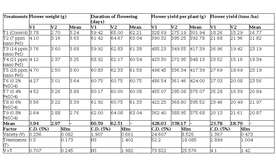 The treatments, varieties and their interaction had significantly influenced the average flower weight, duration of flowering, flower yield per plant and flower yield (Table 3). Irrespective of varieties, average flower weight was recorded maximum (3.89g) in T7 which was statistically at par with T3 (3.68g), T6 (3.64 g), T2 (3.63 g) T5 (3.60 g) and T8 (3.39g) but significantly higher than control (T1). However, it was recorded minimum (2.76 g) in T9. The variety Fiesta Gitana Mix had significantly higher average flower weight (3.94 g) than variety Fiesta Yellow (2.97 g). Among interaction, maximum individual flower weight (4.70 g) was recorded in V1T5 which was at par with V1T7 (4.52 g), V1T6 (4.27 g) and V1T2 (4.10 g), whereas it was recorded minimum (2.37 g) in V2T4. Bakhtiari et al. (2015) reported enhanced spike weight of wheat due to application of nano iron oxide (0.04%). Higher concentration of NPs (1000ppm) enhanced plant growth in Hydrangea paniculata (Karunakaran et al., 2017).