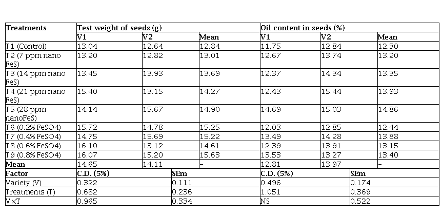 The data on test weight of seeds showed significant effect of treatments, varieties and their interactions (Table 4). Irrespective of varieties, test weight of sedes was recorded highest in T9 (15.63 g) which was statistically at par with treatments T6 (15.25 g), T7 (15.22 g) and T4 (14.90 g) but significantly higher tan rest of the treatments. However, it recorded mínimum in control (T1) (12.84 g). Barring treatments, variety Fiesta Gitana Mix (V1) had significantly higher test weight of seeds (14.65 g) than variety Fiesta Yellow (V2) (14.11 g). Among interaction, maximum test weight of seeds (16.10 g) was recorded in V1T8, which was at par with V1T9 (16.10 g), V1T6 (15.72 g), V2T7 (15.69 g), V2T5 (15.67 g) but significantly higher tan rest of the treatments combinations and was mínimum (12.64) in control. Increased test weight of seeds was observed with increasing concentration of nano iron particles. It may be opined that enhanced test weight