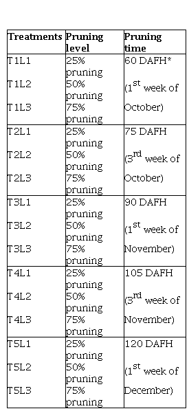 The experiment was conducted at ICAR - IndianInstitute of Horticultur al Resear ch, Benga luru (Karnataka state, India) during two consecutive years,2016-17 and 2017-18. The experimental materialconsisted of eight-year-old one hundred and twentyuniform plants of Annona cv. Arka Sahan planted ata distance of 5m × 5m. The treatments comprised offive pruning times (T1, T2, T3, T4 & T5) and three shootpruning levels (L1, L2, & L3). Pruning was performed after 60, 75, 90, 105 or 120 days after final harvest of the previous crop. Pruning levels consisted of removal of 25 per cent (one-fourth of shoot length), 50 per cent (half of shoot length) or 75 per cent (two-third of shoot length) of the previous season’s growth.Each treatment was replicated four times in a factorialrandomized block design. Two trees were observed ineach replication under each treatment for collection ofdata. Eight trees that were not pruned and giving newshoot growth naturally by the end of March followingleaf abscission during late winter served as external check for comparison of treatment effects againstnatural fruiting as these could not be fitted effectivelyinto the factorial design involving pruning time andintensity. Standard package of practices were adopted for maintena nce of a ll the tr ees dur ing the experimentation.