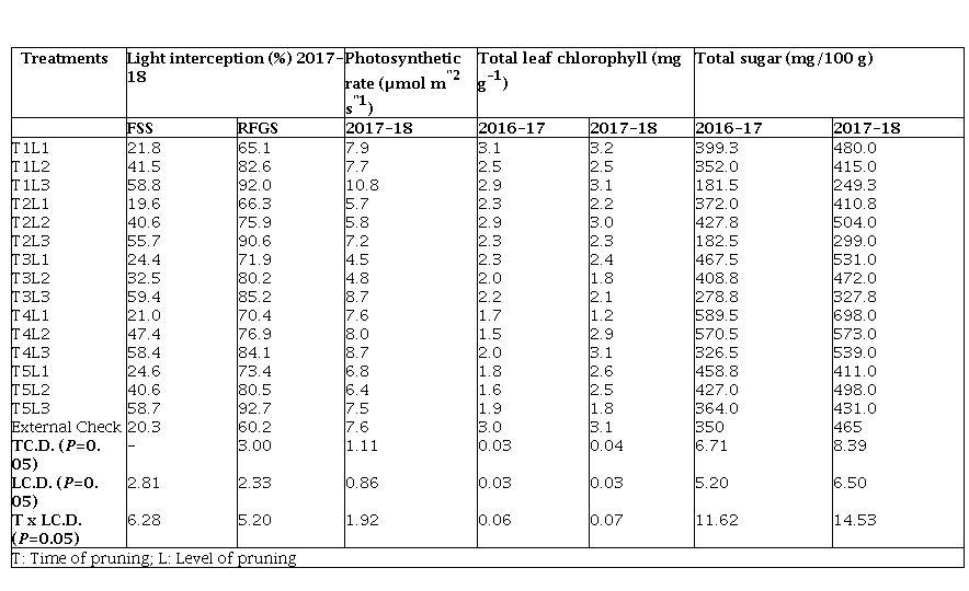 Physiological and biochemical characteristics: Pruning, especially its levels, significantly influenced the amount of light interception at both fruit set stage (FSS) in March and rapid fruit growth stage (RFGS) in May (P<0.05) (Table 2). Higher light interception in different treatments could be related to longer shoot length and higher number of leaves and leaf area in 75 per cent pruned trees (P<0.05). Differential light interception within tree canopies can also influence vegetative growth, flower initiation, fruit set, fruit size and fruit quality (Marini and Marini, 1983). Higher light interception was also associated with higher photosynthetic rate of leaves at both fruit set and rapid fruit growth stage. Pruning provided open canopy area and resulted in maximum interception of sunlight for