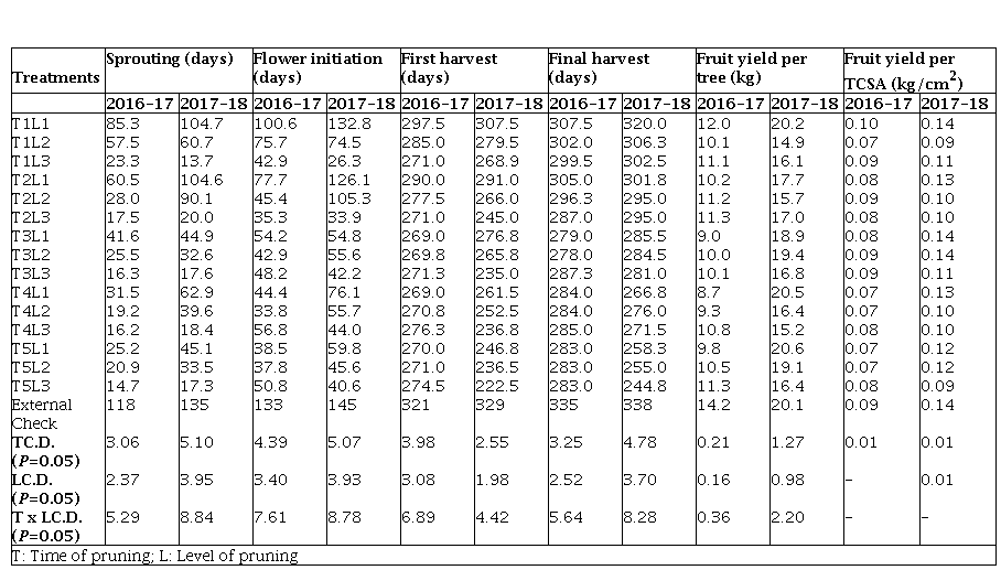 Growth and yield characteristics: Pruning led to leaf fall followed by sprouting of sub petiolar axillary buds on the shoot. Irrespective of pruning time, the number of days required for sprouting has become shorter with the increase of pruning levelduring both the years with minimum number of days to sprout for those pruned in December first week and October first week in first and second years, respectively (P<0.05) (Table3). Early sprouting in trees pruned to 75 per cent level