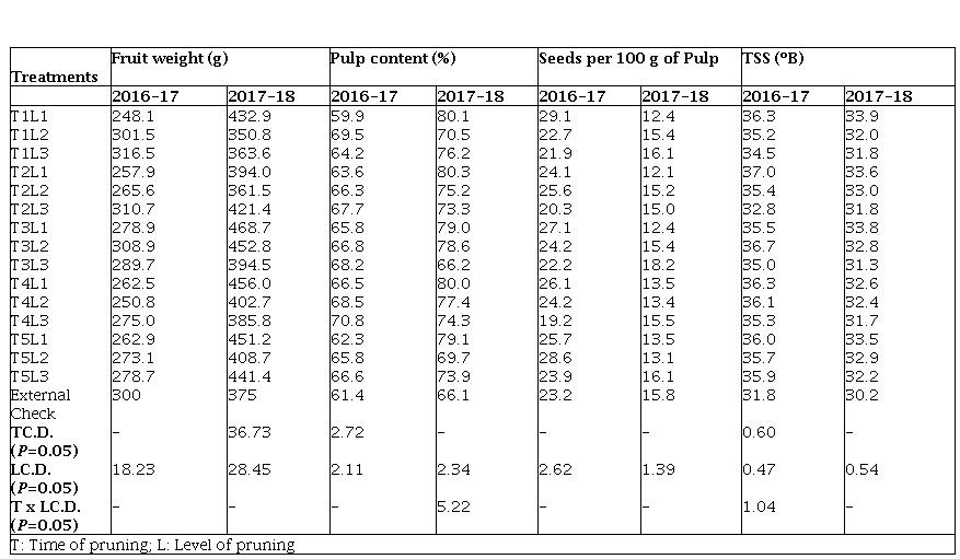 heavier fruit obtained from pruned trees. Pruning influences quality of the fruits by regulating carbohydrate allocation to the developing fruits (Palanichamy et al., 2011). Early pruning during October-November resulted in increased level of total soluble solids (TSS) of the fruit than the later or trees not pruned (P<0.05) (Table 4). The prevailing congenial temperature during fruit growth and maturation could have contributed for accumulation of more sugar in the developing fruits as the fruits come to harvest earlier in these pruned trees. In both the years, comparatively higher value of prevailing average maximum temperature (31.11, 31.50°C) was recorded from flowering to fruit maturity (February to June) for October-November pruned trees than the late pruned trees wherein lesser average maximum temperature (30.73, 30.33°C) was recorded from flowering to fruit maturity (April to August). The results are in conformity with those of Kadam et al. (2018) in custard apple cv. Dharur-6 where fruits from light pruned (20 cm) trees recorded maximum TSS content. In contrast, heavy pruning resulted in accumulation of more TSS in grapes (Zabadal et al., 2002) and peach (Chitkara et al., 1991). There were no consistent trends of acidity content of fruit pulp although higher level of acidity was observed in trees pruned to 75 per cent level (data not presented). Chitkara et al. (1991) and Kumar et al. (2010) recorded increased acidity level with the increase of pruning severity in peaches. Similar results were obtained by Mehta et al. (2012) in guava and Kadam et al. (2018) in custard apple cv. Dharur-6.